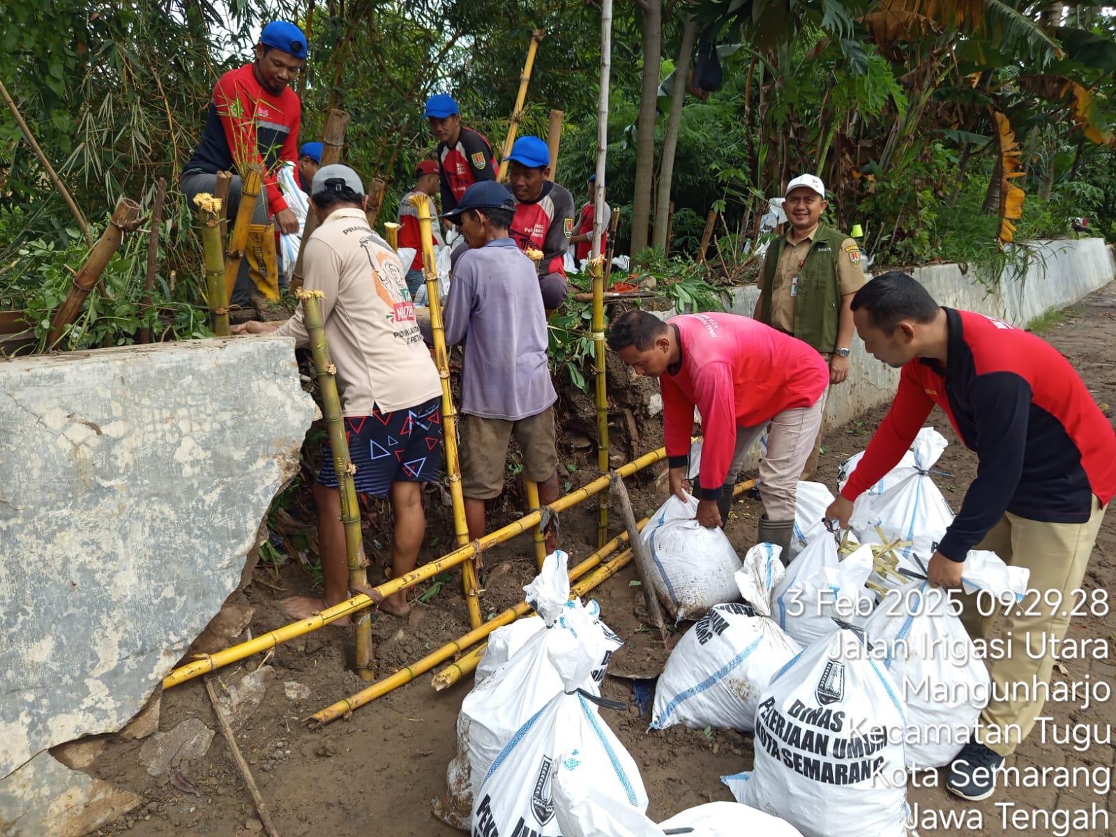 Setelah menerima laporan kejadian, DPU Kota Semarang langsung melakukan penanganan darurat dengan memasang cerucuk bambu dan sandbag sebagai penguatan sementara.