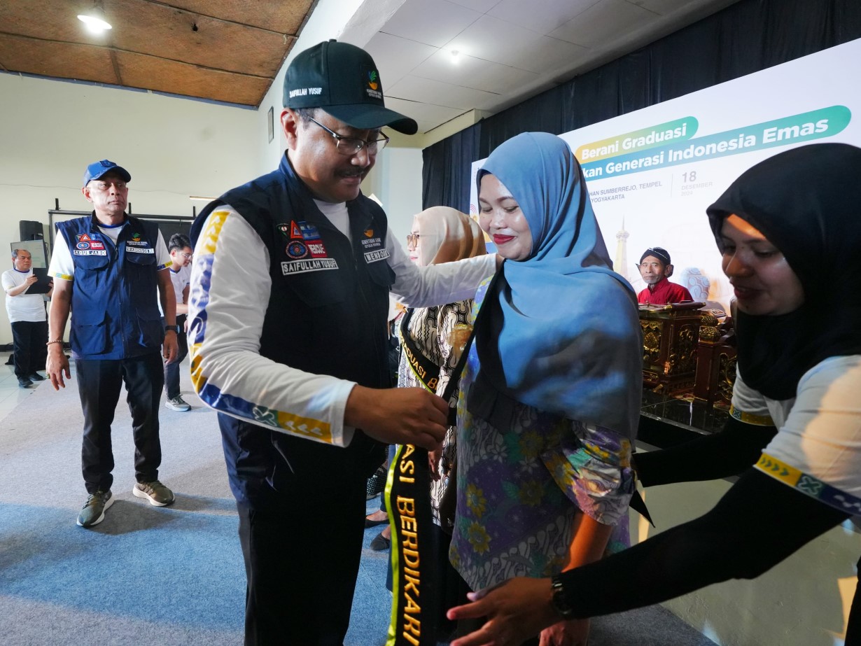 Dalam rangkaian Hari Kesetiakawanan Sosial Nasional (HKSN) 2024 di Kab. Sleman, DIY pada Rabu (18/12/2024), Gus Ipul dan Wakil Menteri Sosial Agus Jabo Priyono tampak mengalungkan selempang kepada 10 penerima manfaat (PM) yang telah lulus (graduasi) dari program bantuan sosial Kemensos.