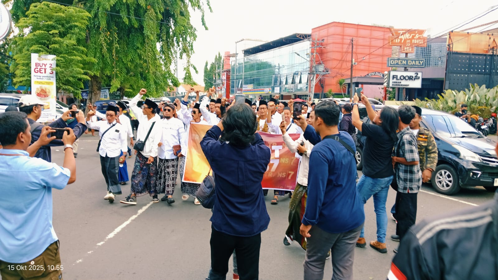 Massa yang didominasi para santri dan alumni pondok pesantren itu datang mengenakan sarung dan peci. Mereka membawa spanduk bertuliskan “Boikot Trans7! Jaga Marwah Pesantren!” serta “KPI Harus Tegas, Jangan Biarkan Media Hina Ulama!”. Aksi dimulai sekitar pukul 11.00 WIB dan berlangsung tertib di bawah pengamanan aparat kepolisian.